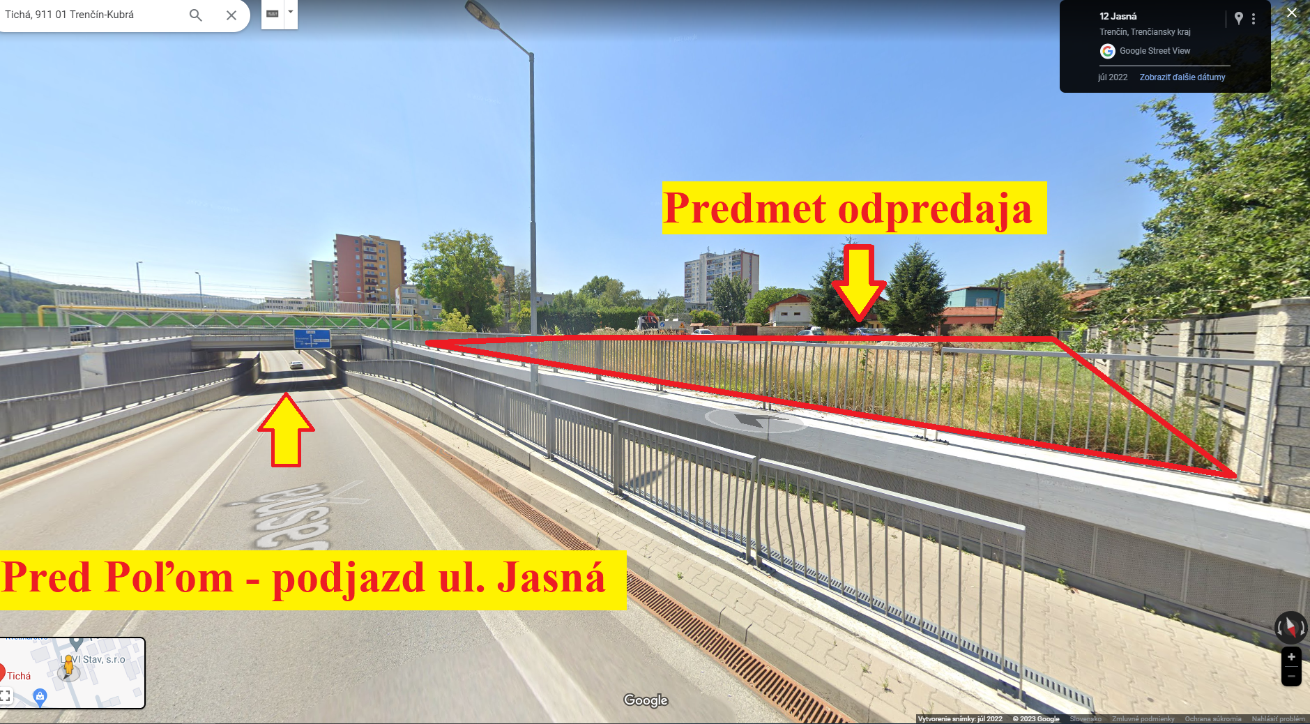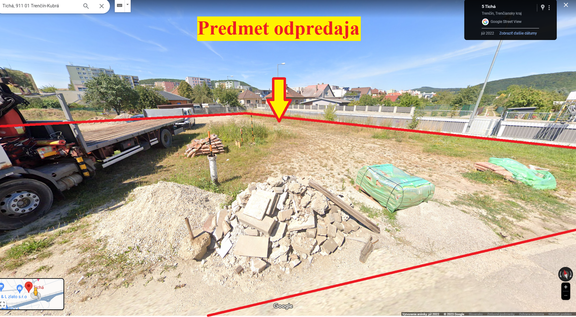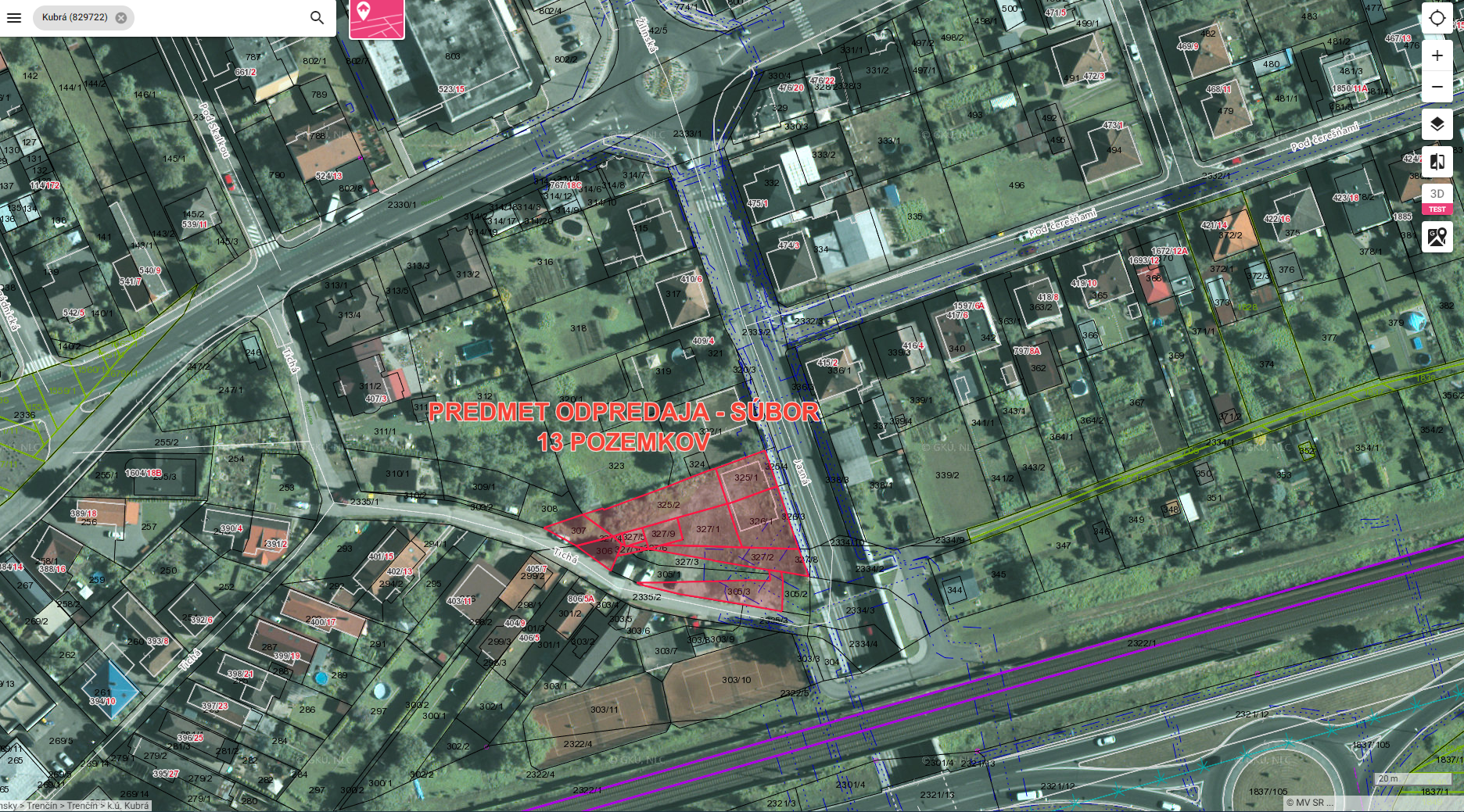 Predmetom ponuky je súbor 13 pozemkov. Odpredávané pozemky sa nachádzajú v zastavanom území mesta Trenčín, v k. ú. Kubrá, na ulici Tichá. Pozemky v celosti majú nepravidelný tvar, sú rovinaté, v súčasnosti v časti pokryté trávnatým a drevnatým porastom, v časti vo forme utláčanej zeminy využívanej pre prístup, skladovanie a odstavenie motorových vozidiel. K pozemkom je možnosť napojenia na verejný vodovodný rád, verejnú kanalizačnú sieť, rozvodnú sieť zemného plynu a káblové NN rozvody vedené pozdĺž komunikácie parc. č. 2335/1 a 2335/2 – ulica Tichá. Časť z predmetných pozemkov sa nachádza v ochrannom pásme dráhy (vzdialenosť od osi krajnej koľaje 32m).