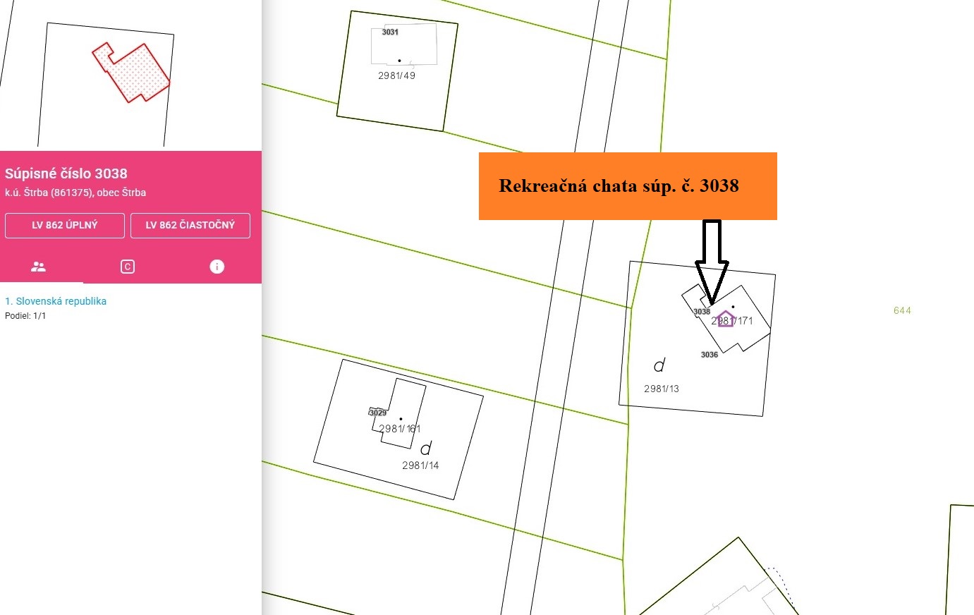 • stavba súpisné číslo 3038 na pozemku registra C KN parc.č. 644, popis stavby rekreačná chata, zapísaná na LV č. 862 v podiele 1/1 pre k.ú. Štrba
